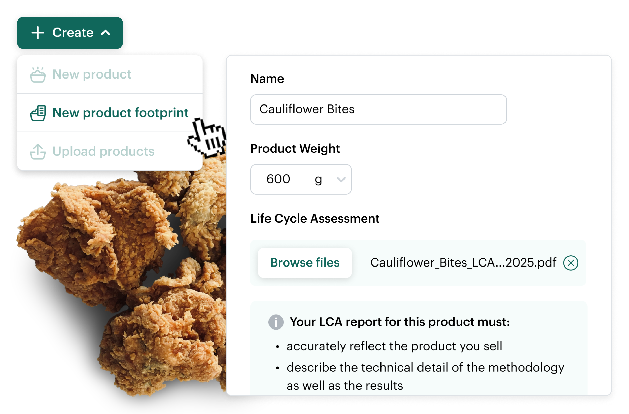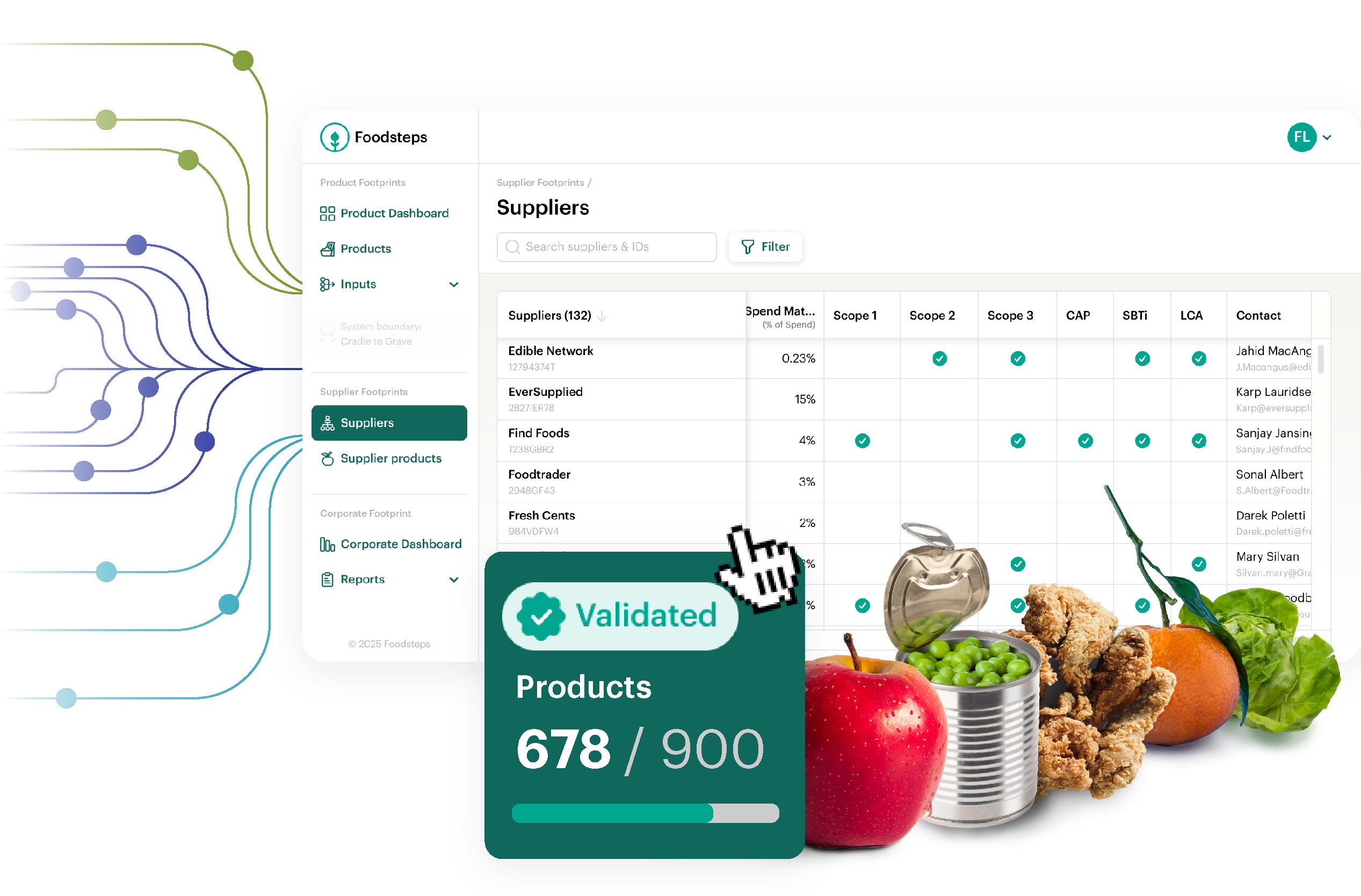 Invite suppliers to share product assessments (LCAs, PCFs) and supporting evidence through guided workflows - with structured questions to confirm methodology and data quality. Foodsteps handles any necessary follow-up to minimise burden on both you and your suppliers.